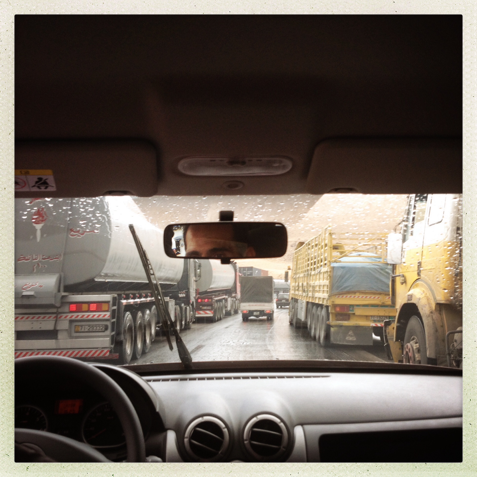 Back on the highway and little did we realise how much the wet weather would affect all the lorries on the road. There are weighing stations placed along the highway. Most of the lorries are carrying very heavy loads, so you see some of them parked up about a km away from the weighing stations, waiting till they close so they can continue their journey without being stopped. Majority of the lorries also have what we call in the UK ‘bald tyres’. Absolutely no grip. Combine the heavy loads, bald tyres and a hill road which is wet = lorries slowly sliding into the central reservation to use the barrier to stop them. There were dozens of lorries stuck going up and down the hill. Those trying to drive up the hill, all you could see was their tyres turning but the lorry itself was still sliding back down the hill. Omran skilfully managed to squeeze in between some lorries to drive us through to a gap and onwards to safety.